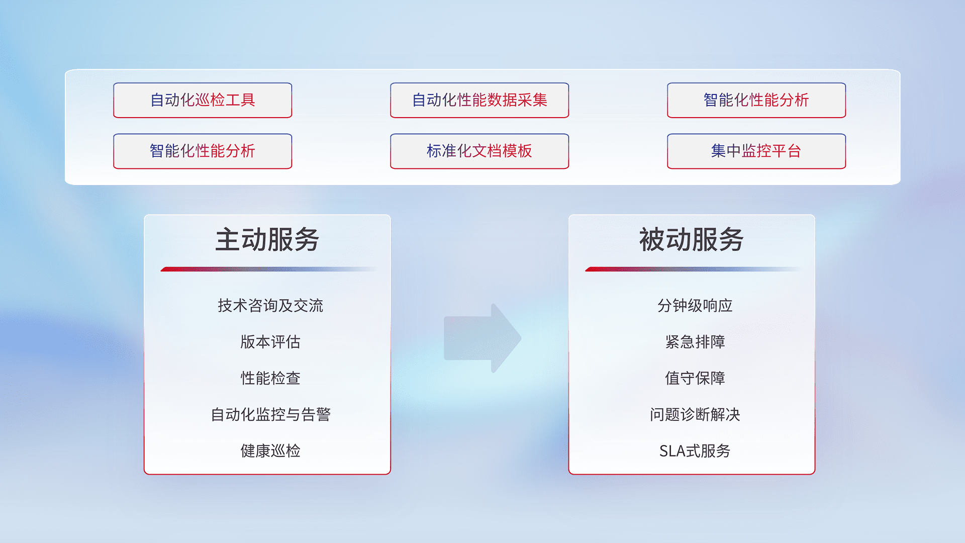 智能化工具和标准化文档,,保障服务质量,,,,提供主动服务(包含技术咨询、、、、版本评估、、性能检查、、自动化监控与告警、、、、健康巡检)和被动服务包含(分钟级响应、、、紧急排障、、、、值守保障、、、、问题诊断解决、、、、SLA服务)。。